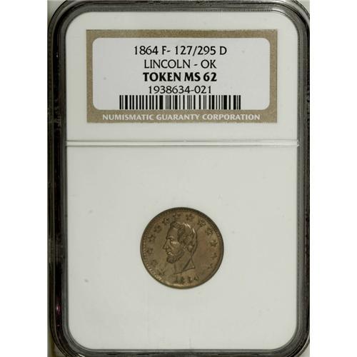 <B>1864 Abraham Lincoln, Fuld 127/295D, MS62 NGC.</B></I> Copper-nickel. A nice Lincoln Civil War token, designated R.6 in Kanzinger and with an MS60 catalog value of $175.<BR><BR><b>Shipping:</b> Coin/Currency (<a target="_blank" href="http://www.heritageauctions.com/common/shipping.php">view shipping information</a>)