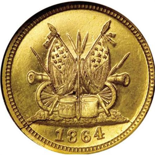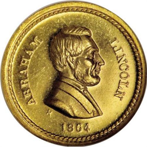 <B>1864 Abraham Lincoln in Gilt, MS67 Prooflike NGC.</B></I> Fuld-129/349k, rope border, R.8. The obverse features a profile of President Lincoln facing right, with ABRAHAM to the left and LINCOLN to the right, the date 1864 below. This dual-dated piece has the Flags, Cannons, and Drums patriotic reverse, also with the date 1864 below. All marriages of these two dies are R.8 or R.9 in the Kanzinger reference (2002), but in gilt in such an extremely high grade, <I>this Lincoln piece must qualify as one of the most desirable Civil War tokens known. </B></I>Gilt Civil War tokens of any variety are rare, and this piece is certainly one of the finest Civil War tokens known to the members of the Heritage cataloging staff. <BR> The surfaces are fully prooflike on each side, with the thick mint frost on the high-relief Lincoln portrait and blindingly mirrored, reflective fields on each side accenting even more boldly the cameo effect of the Lincoln design. The obverse die, which still existed in 1930 and from which restrikes were made at that time (with a different reverse die), shows non-grade-affecting die breaks in the loops of the 8 and 6 in the date. The reverse die is somewhat rotated, perhaps 15 degrees clockwise from the obverse. <BR> The Kanzinger reference (2002) values this piece, in MS60-62, at $350, a price that is laughably low for this piece, likely among the finest of any gilt Civil War tokens and among the finest certified, regardless of variety or rarity. It will be an exciting moment in the auction room when this piece crosses the block, as it seems almost certainly destined to set a new record.<BR><BR><b>Shipping:</b> Coins & Currency (<a target="_blank" href="http://www.heritageauctions.com/common/shipping.php">view shipping information</a>)