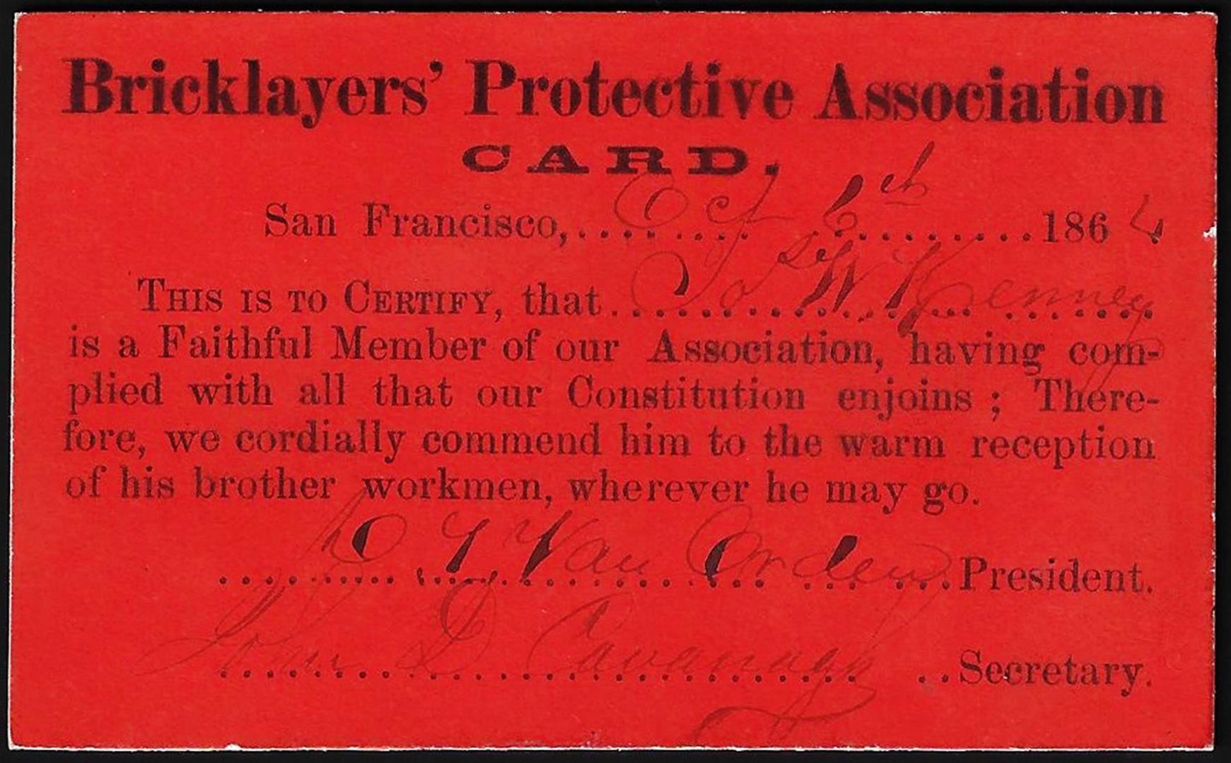 One 1864 Bricklayers Protection Association Card.