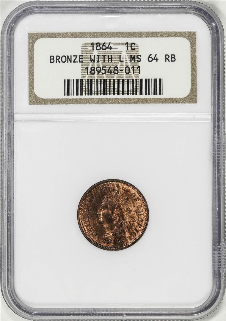 One 1864 Bronze with L on Ribbon Indian Head Cent Coin NGC MS64RB. NGC Certified.