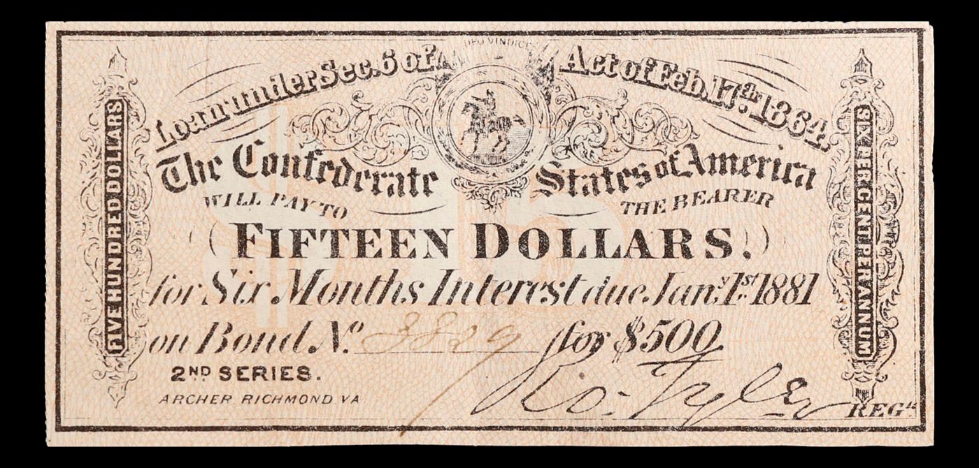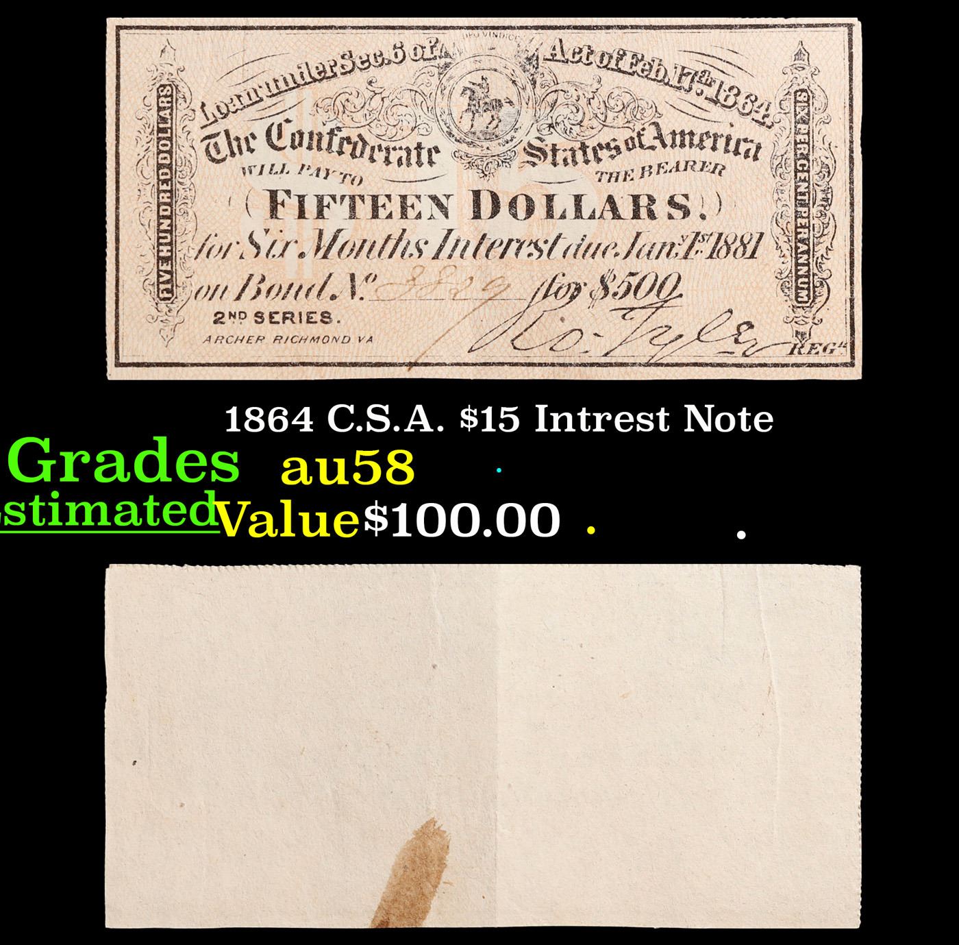 1864 C.S.A. $15 Intrest Note Grades Choice AU/BU Slider.