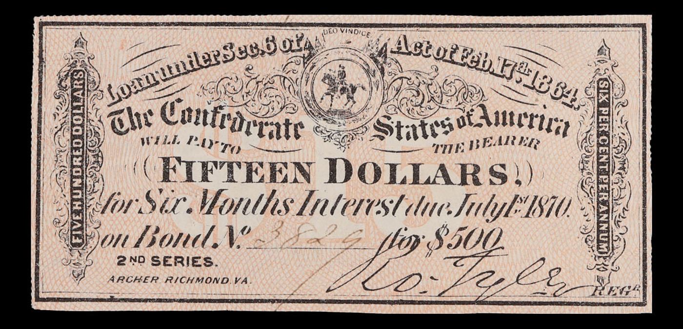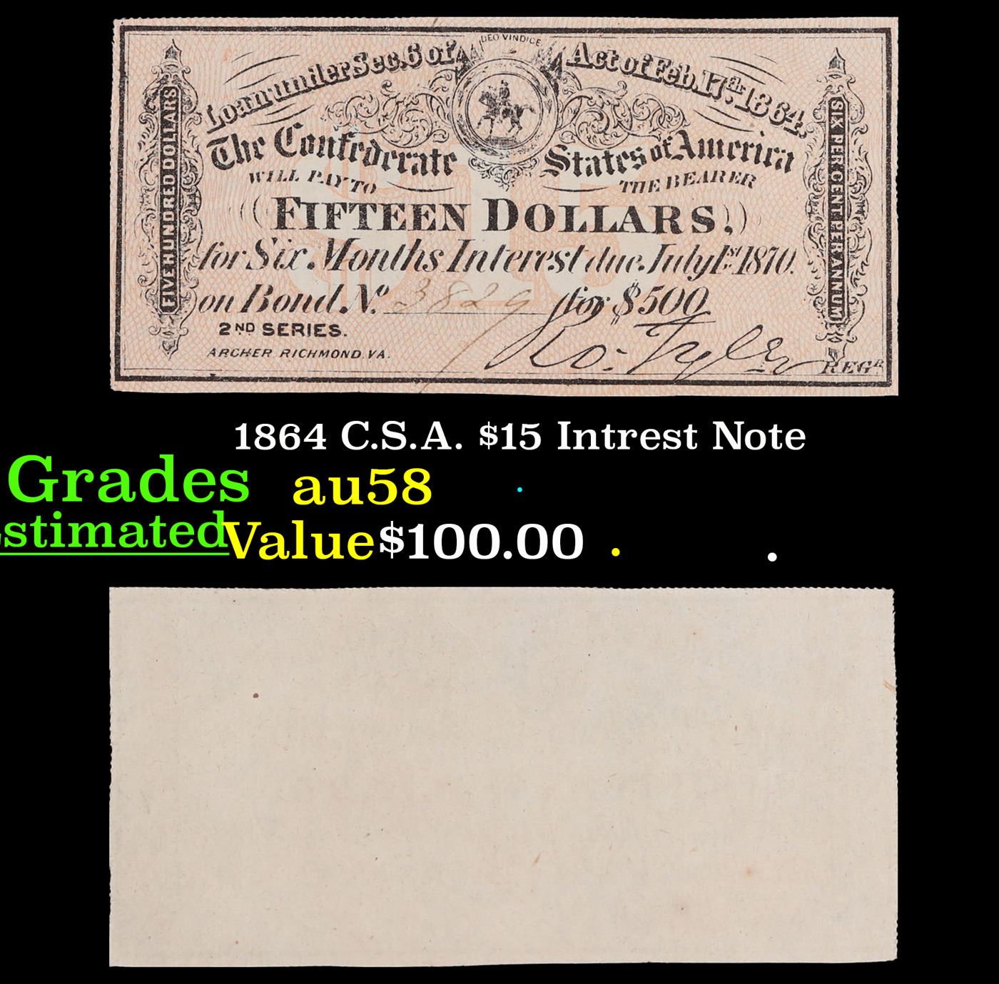 1864 C.S.A. $15 Intrest Note Grades Choice AU/BU Slider.