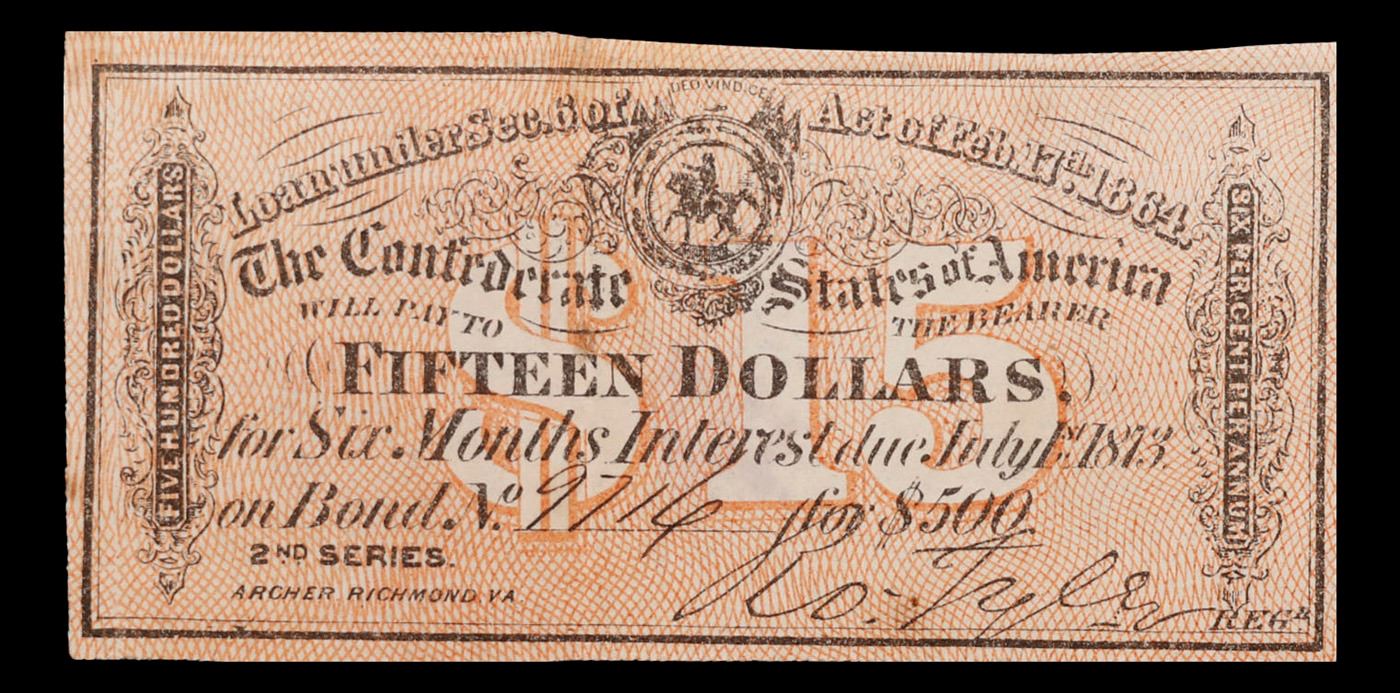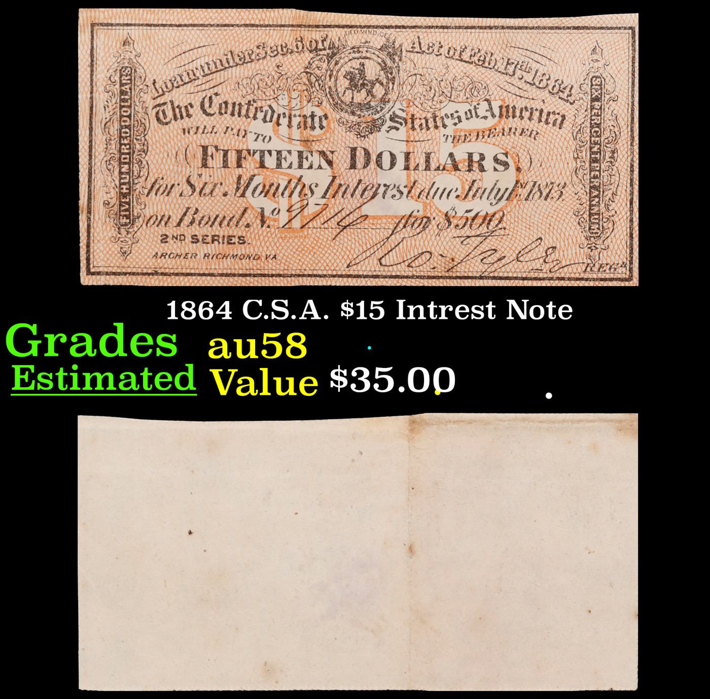 1864 C.S.A. $15 Intrest Note Grades Choice AU/BU Slider.