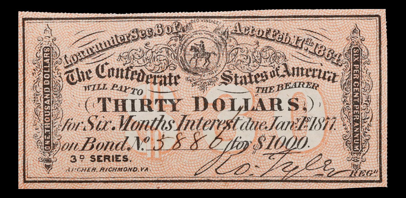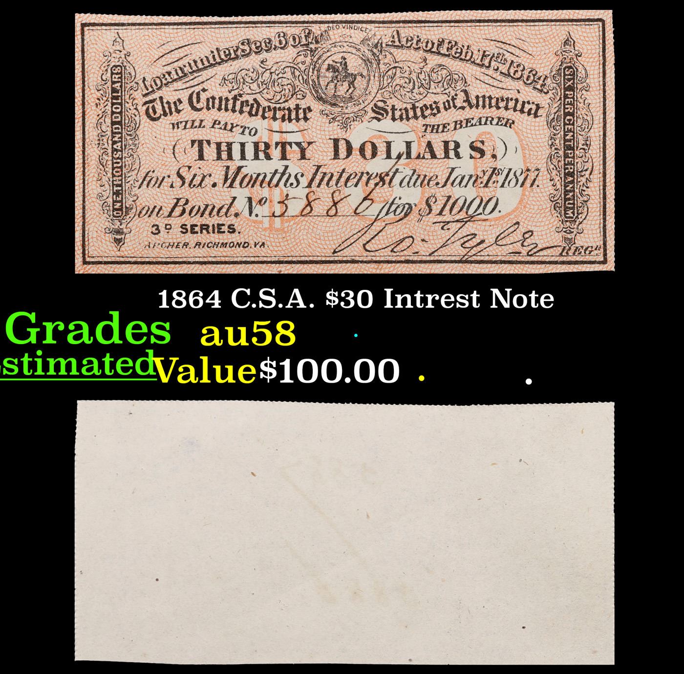 1864 C.S.A. $30 Intrest Note Grades Choice AU/BU Slider.
