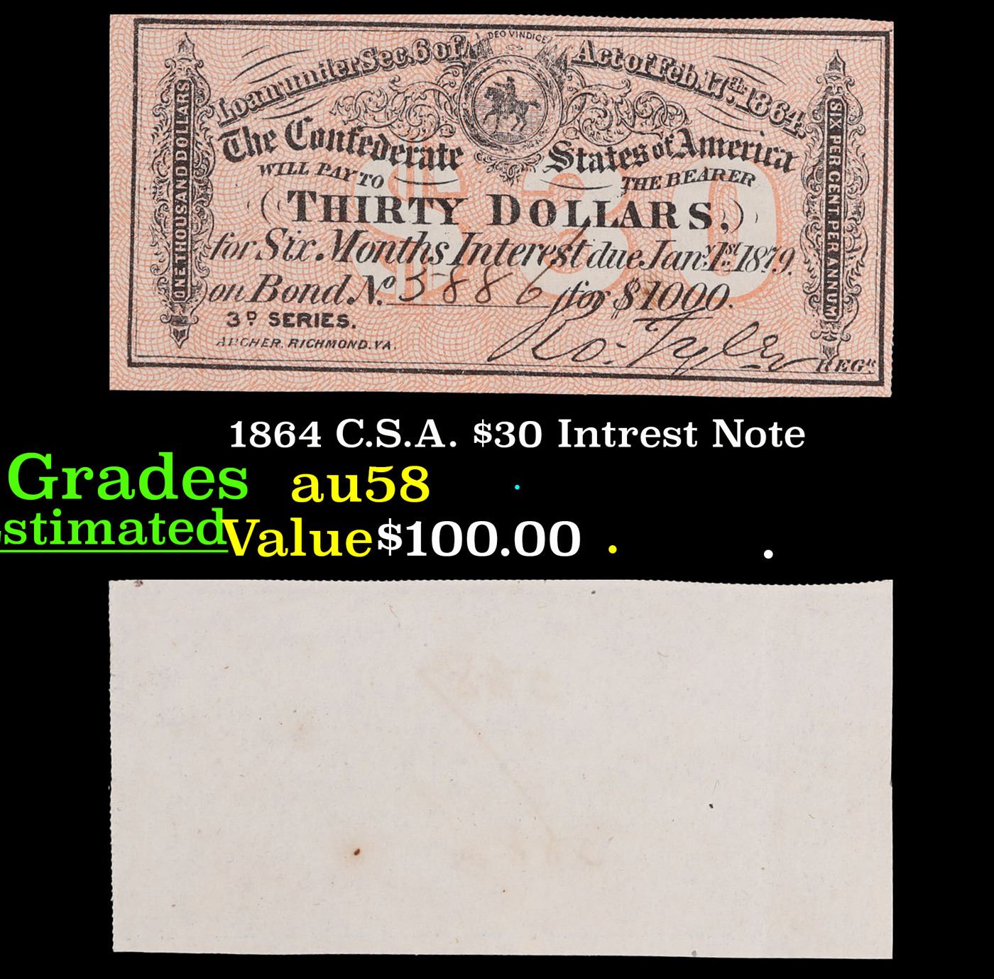 1864 C.S.A. $30 Intrest Note Grades Choice AU/BU Slider.