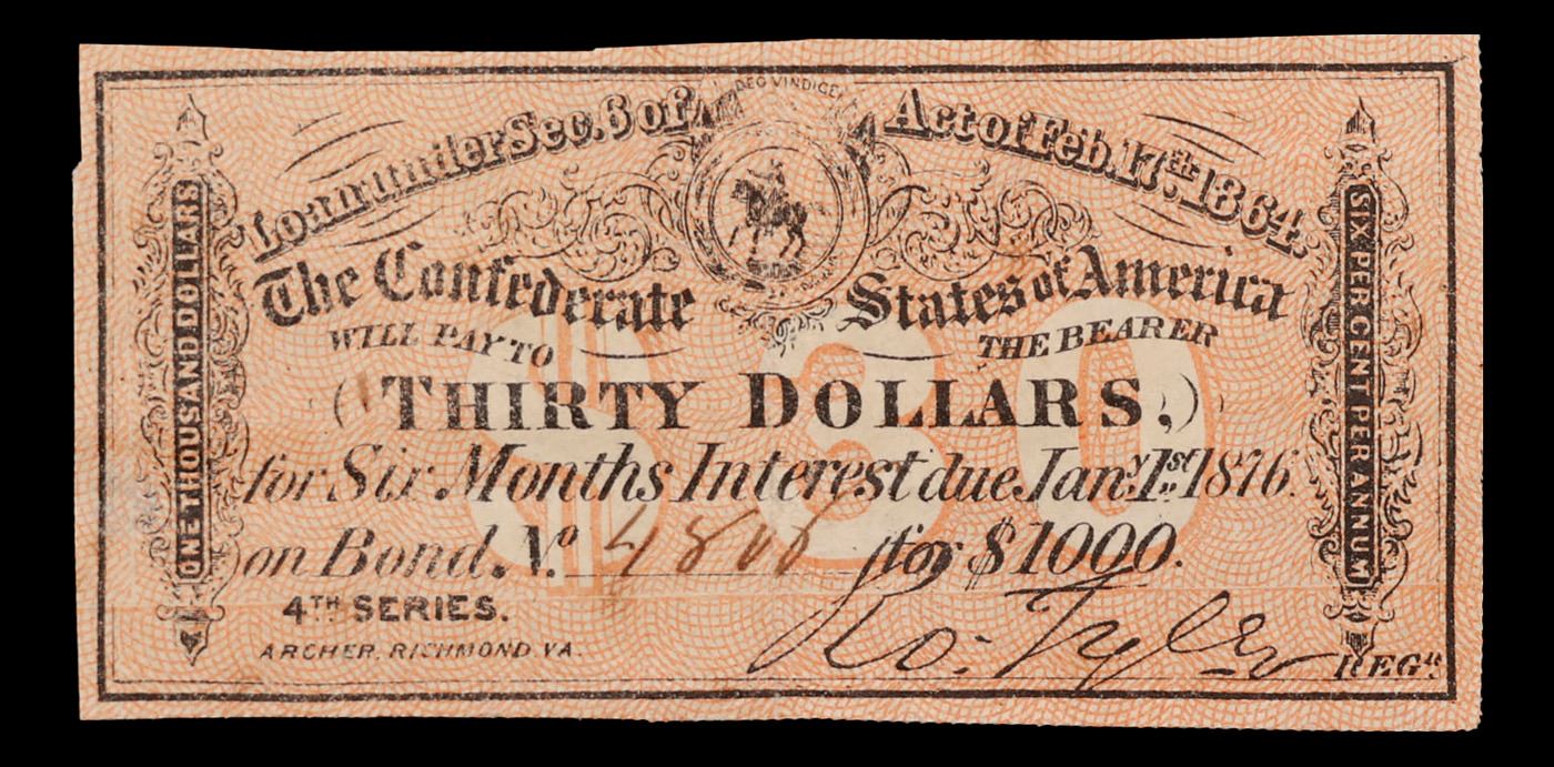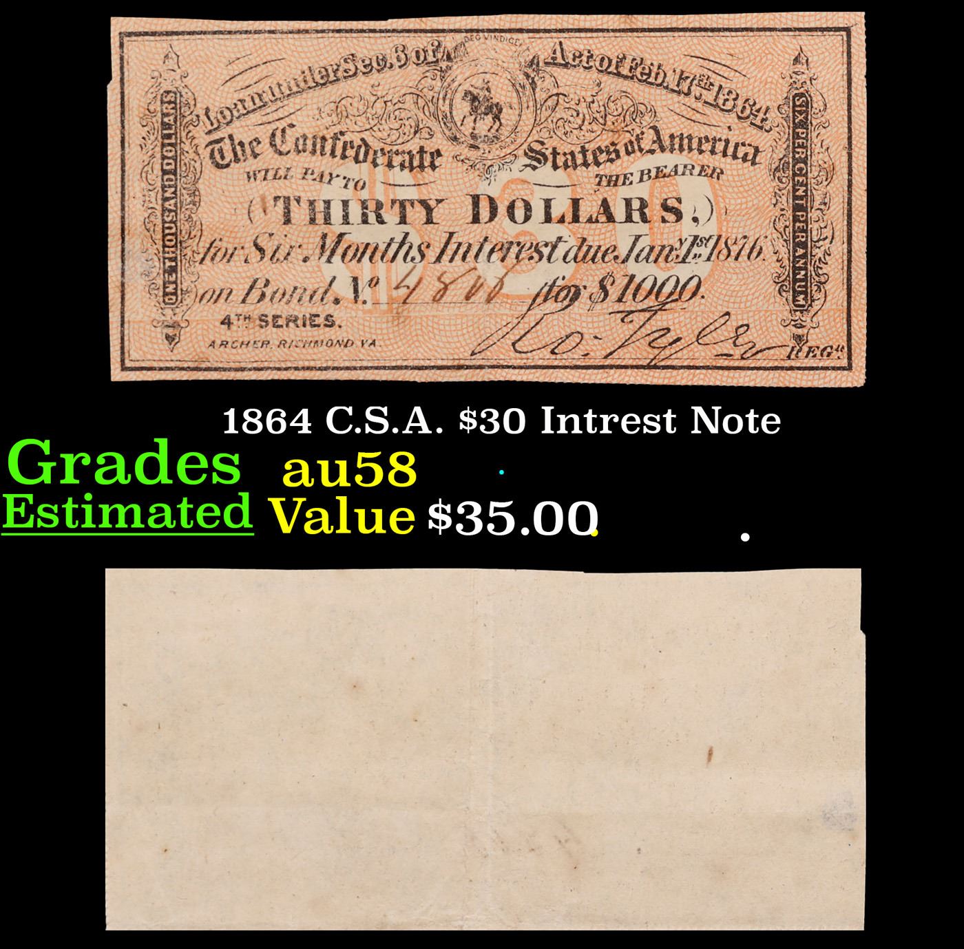 1864 C.S.A. $30 Intrest Note Grades Choice AU/BU Slider.