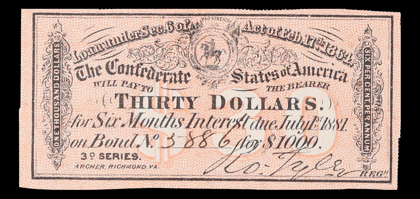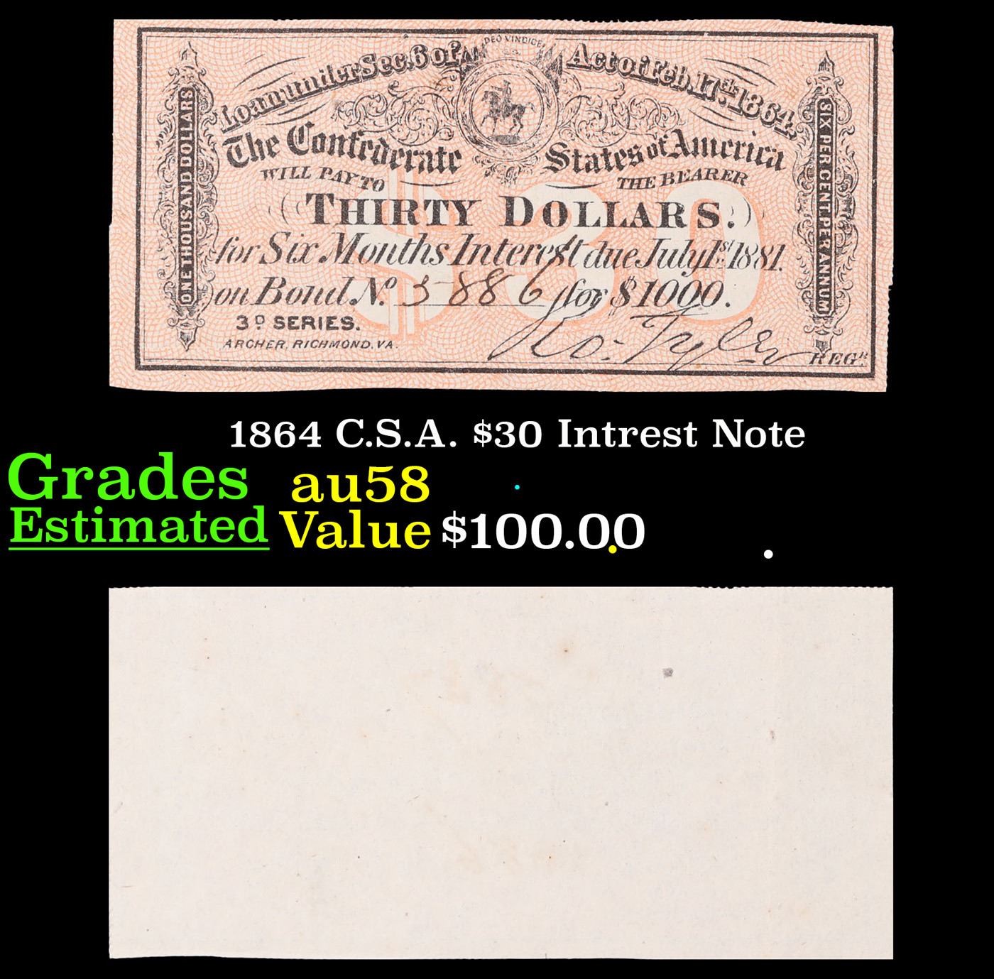 1864 C.S.A. $30 Intrest Note Grades Choice AU/BU Slider.