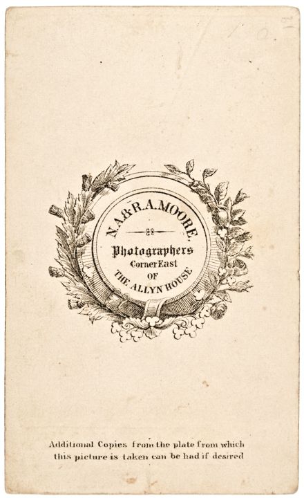 Original 1864 Carte de Visite Photograph of, William Hutchings, 2.5” x 4”. Caption below photo reads, "William Hutchings, Aged 100, ONE OF THE SURVIVORS OF THE REVOLUTION. Entered according to act of Congress, in the year 1864, by N.A. & R.A. Moore, of Hartford, in the clerk's office of the district court of Connecticut." Photo shows Hutchings seated and holding his cane. Backstamp reads, "N.A. & R.A. Moore / Photographers Corner East of the Allyn House". Also text at bottom reads, “Additional Copies from the plate from which this picture is taken can be had if desired. Minor soiling not affecting image, small outer piece of the upper right corner of photo missing, not near the iomage. The last example we offered was sold in our EAHA Auction of February 9, 2008, Lot 213, which sold for $675. One of a series of six done in conjunction with Hilliard's volume "Last Men of the Revolution," and issued as separate cards. After the Revolutionary War he married, settled in Penobscot Bay, and fathered 15 children. He died in 1866 at the age of 102.