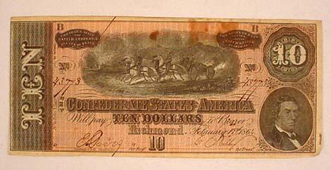 1864 CIVIL WAR ERA CONFEDERATE 10 DOLLAR NOTE / BILL