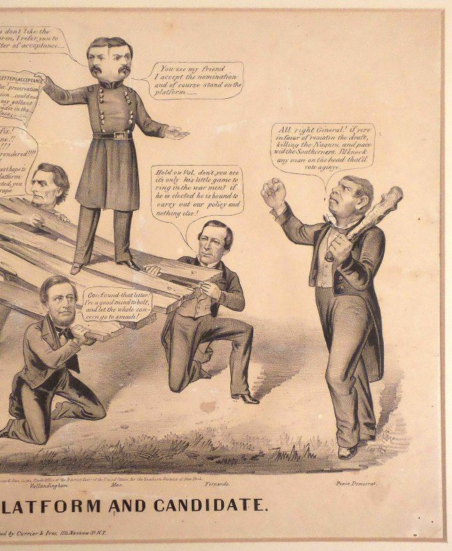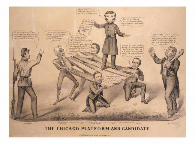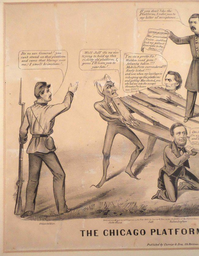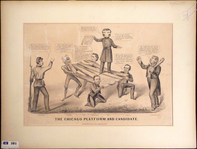 Lithograph titled "The Chicago Platform and Candidate," published by Currier & Ives, New York, N.Y., 1864." [13" H x 18" W]. Metaphorical illustration depicting George McClellan standing on the Chicago Platform supported by the Devil, Jefferson Davis, Vallandigham, and Wood. At the left, a Union soldier advises him to repudiate the platform, while at the right, an Irish thug, labeled "Peace Democrat", threatens anyone who stands in McClellan's way. Bears O. Rundle Gilbert Auctioneer tag at bottom left corner of matte. Uneven age-toning, creases, irregularly trimmed bottom edge, stains, and few repaired margin tears. Bears archival tape hinge on verso.