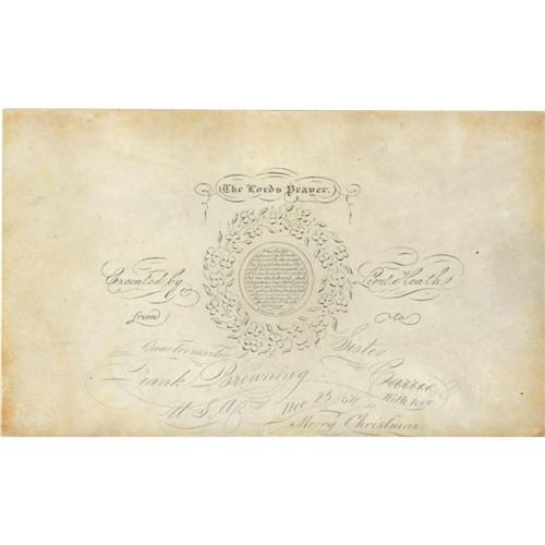 <B>Small 1864 Christmas Card from Union Lieutenant and Quartermaster Frank Browning to His Sister.</B></I> This small and unique item measures approximately 3.5" x 2.25", about the size of a modern business card, and features <I>The Lord's Prayer</B></I> in a circular field inside a decorative wreath. It is signed by the artist at bottom, "<I>H. Heath Artist</B></I>". The text surrounding the prayer reads, "<I>Executed by Lieut. Heath from Quartermaster Frank Browning U.S.A. to Sister Carrie with love Dec. 25 / 64 Merry Christmas</B></I>". The card appears to be handwritten in total. The prayer, the wreath, and all of the text in the darker ink is most likely written in the hand of Lieutenant Horace Heath of the 3rd Connecticut Infantry. The lighter ink is most likely Browning's hand, since the card is addressed expressly to his sister. Little is known of Browning save that he mustered in with the Ohio 7th Cavalry in 1862 and resigned as Lieutenant and Quartermaster of the Connecticut 116th Infantry in May of 1865. The card is in a clear holder, which has been affixed to a 7.75" x 10.5" display page. The card is in very fine condition, with only moderate age-toning around the edges. A wonderful piece of ephemera for the Union enthusiast.<BR><BR><b>Shipping:</b> Miscellaneous Collectibles, Smal (<a target="_blank" href="http://www.heritageauctions.com/common/shipping.php">view shipping information</a>)