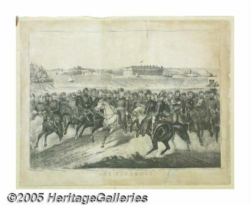 <B>1864 Civil War Union Print "Our Generals"</B></I> Here is a large engraved print by J. Smith of Philadelphia, copyright 1864 titled <I>Our Generals.</B></I> It pictures a group of Union generals (sort of a "Dream Team") on horseback with Fort Lafayette and New York Harbor in the background. Fort Lafayette was a military prison where political prisoners were confined. Generals pictured and named are: Curtis, Buttler [sic], Sherman, Gilmore, Meade, Sickles, McDowell, McClellan, Hooker, Scott, Halleck, Fitzpatrick, Burnside, Sigel, Grant, Banks, Fremont, Dix, Thomas, and Rosecrans. Print size is 28" x 22" and it has been backed with a larger piece of linen. Good condition with some soiling, tears and edge roughness but still presents very well. Excellent item for the Civil War military buff. Lot:251