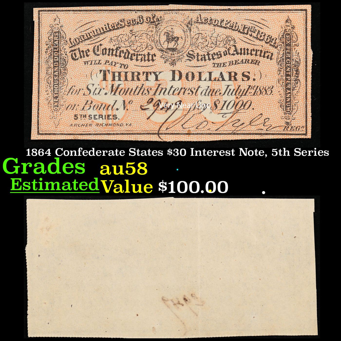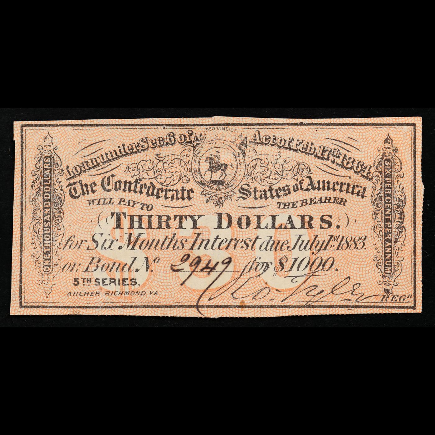 1864 Confederate States $30 Interest Note, 5th Series Grades Choice AU/BU Slider. In order to fund their war effort, the newly formed Confederacy issued bonds to their citizens in 1861. These bonds included a series of coupons intended to be turned in individually for the periodic interest return on the bond, which are hand-numbered and hand-signed. These are a rare paper artifact of the Civil War.