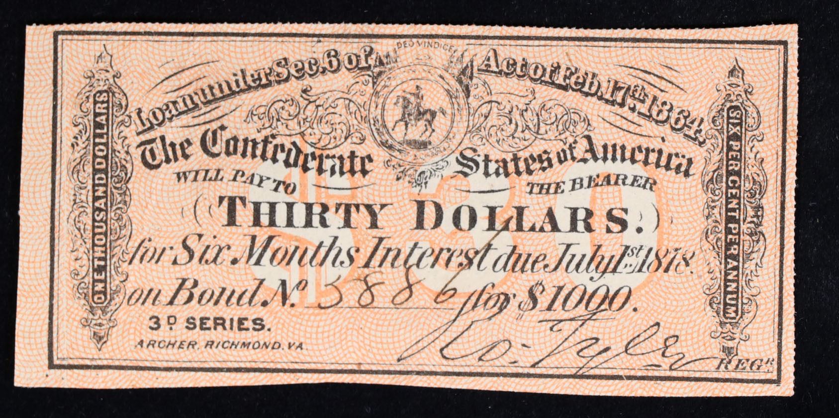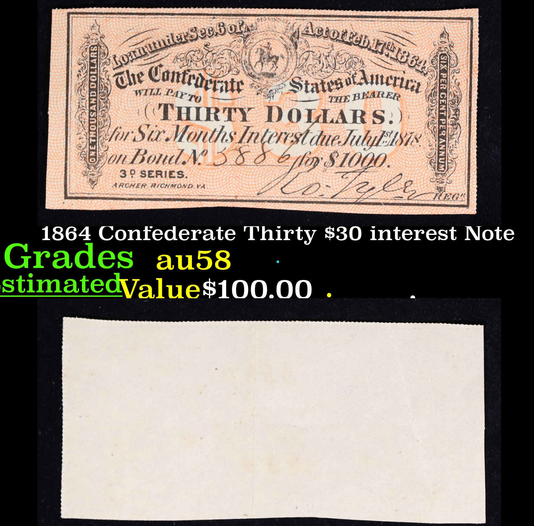 1864 Confederate Thirty $30 interest Note Grades Choice AU/BU Slider.