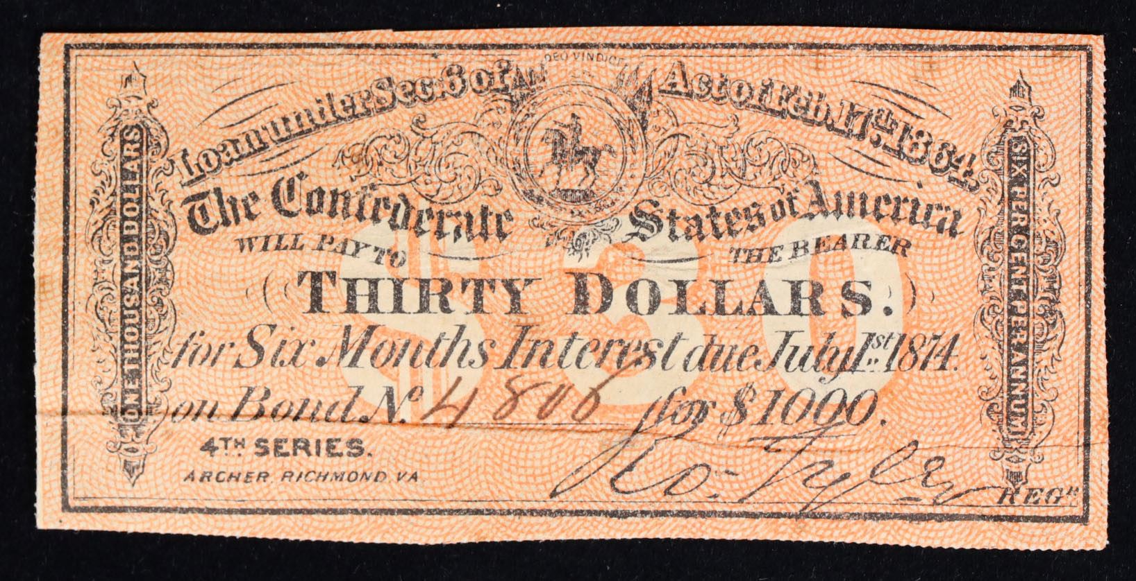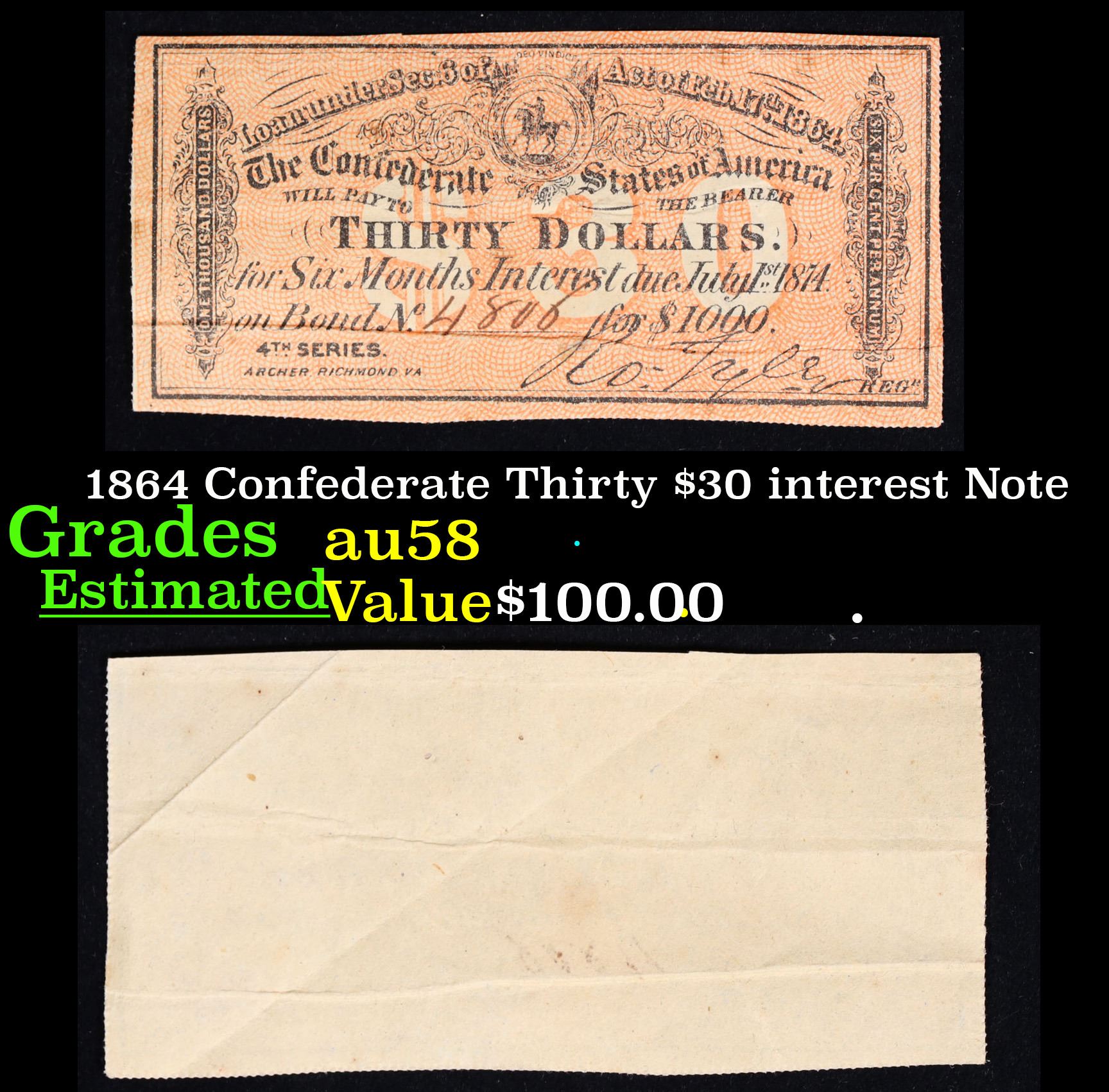 1864 Confederate Thirty $30 interest Note Grades Choice AU/BU Slider.