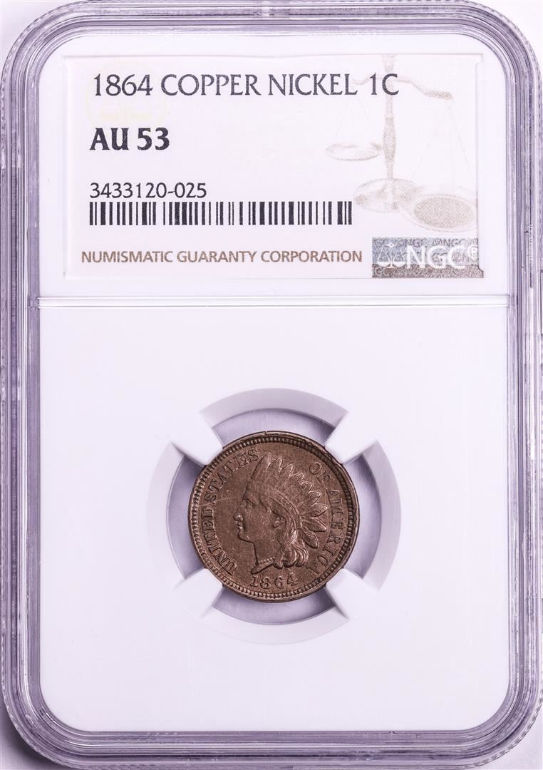 One 1864 Copper Nickel Indian Head Cent Coin NGC AU53. NGC Certified.