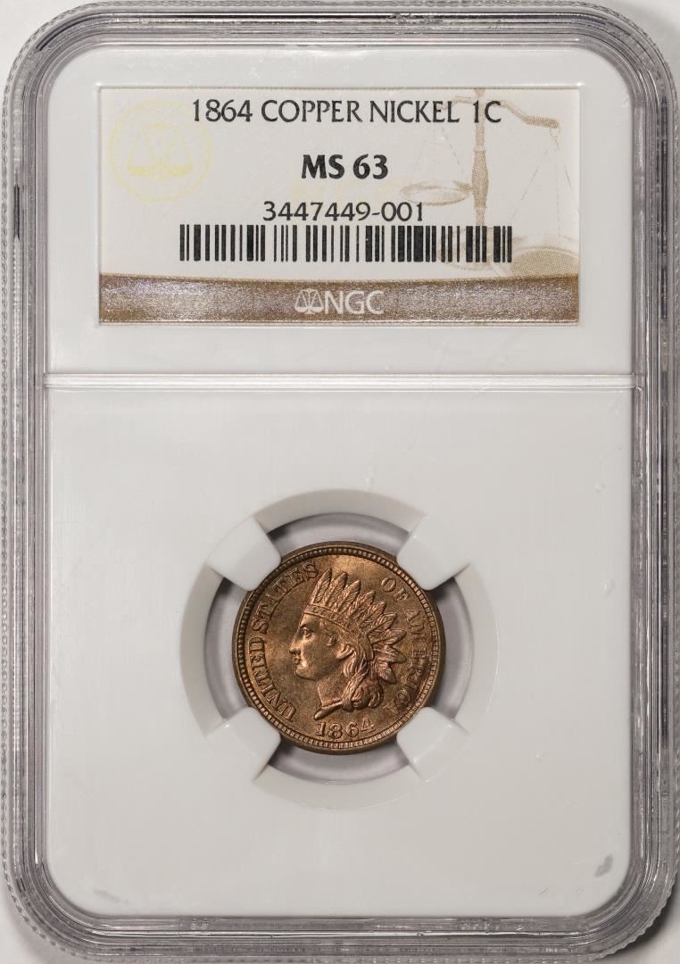 One 1864 Copper Nickel Indian Head Cent Coin NGC MS63. NGC Certified.