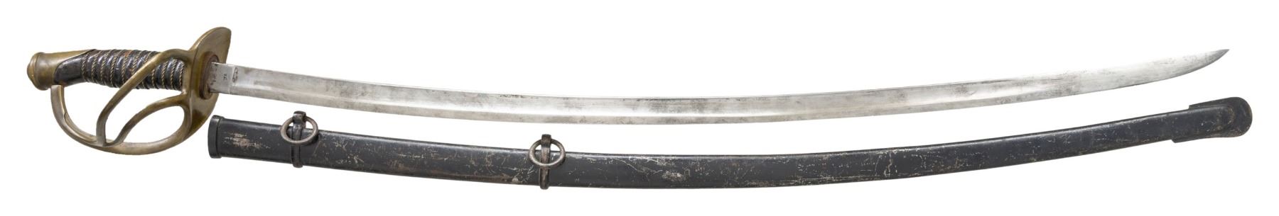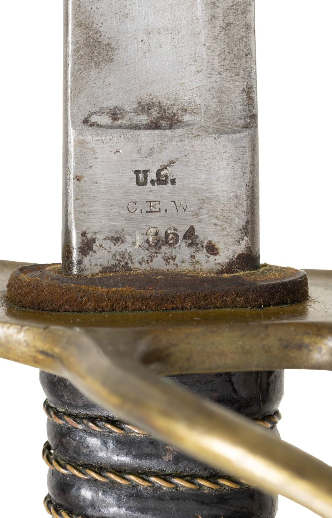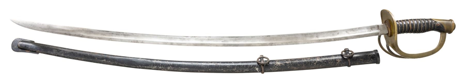 SCABBARD. Overall length: 42.5". Blade length: 35". Plain blade with a single wide fuller and a secondary fuller near the spine. The ricasso is marked "U.S. / C.E.W. / 1864." Brass semi-basket hilt with 2-branch guard. Wire-wrapped leather grip. Iron scabbard with black paint. CONDITION: blade shows cleaning along with gray patina throughout. Worn Ames markings on ricasso. Hilt shows mustard patina with spot of verdigris. Scabbard has noticeable dent w/ scattered finish loss & light oxidation. Leather shows flaking finish. (02-25356/MD). NON-GUN. $300-500.
