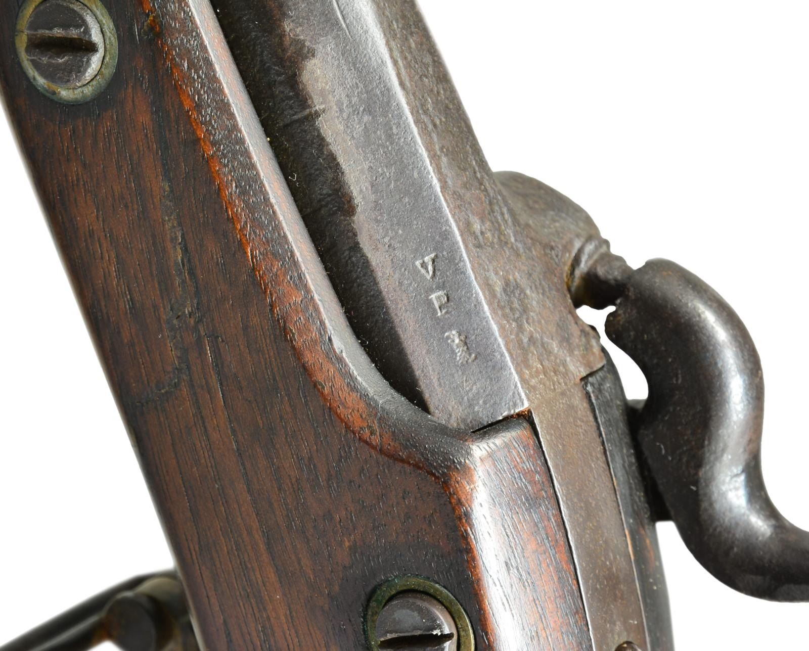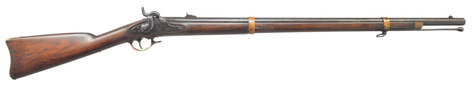 Cal. .58. NSN. This is another honest orig. example of 1864 dated Fayetteville, not as fine as the exemplary example sold in previous lot but still a superior gun w/ good markings that saw use in the war. Standard configuration 33” bbl., V/P eagle head proofs, lock marked “CSA” & “Fayetteville” & “1864.” Buttplate has “CSA” surcharge; both brass bbl. bands properly marked “U”. CONDITION: good-very good overall. Complete & original incl. rear sight, sling swivels & ramrod. Bbl. & lock have dark iron patina w/ several scattered deep scratches on top of bbl near muzzle. Brass has been cleaned w/ mottled mixed mustard/copper patina. Stock is sound & solid w/ well disguised crack repair, no discernible cartouche. Mechanically fine w/ well discerned rifled bore w/ pitting. (01-19855/JS). ANTIQUE. $8,000-12,000.