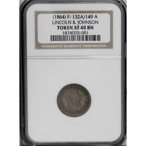 <B>(1864) Lincoln & Johnson, Fuld-132a/149, King 226, DeWitt Al 1864-68. R.5, XF40 NGC.</B></I> This popular Civil War presidential token features the bust of President Abraham Lincoln on one side and Vice President Andrew Johnson on the other.<BR><I>From The Troy Wiseman Collection.</B></I>