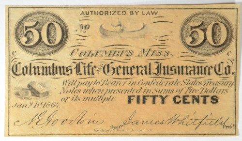 1864 FIFTY CENT COLUMBUS LIFE & GENERAL INSURANCE CO. COLUMBUS, MS