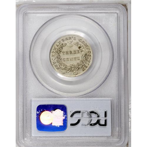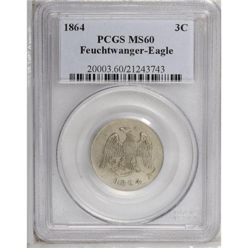<B>1864 Feuchtwanger Three Cent Token MS60 PCGS.</B></I> HT-267, R.6. While Feuchtwanger's 1837 cent tokens are readily available, the same cannot be said for this rare three cents variety. Not to be confused with HT-262, the obverse type features an eagle with lowered wings and no rock beneath. Well struck aside from a small portion of the right side of the wreath, and with smooth surfaces for the grade.<BR><I>From The Stone 1837 Collection.</B></I><BR><BR><b>Shipping:</b> Coin/Currency (<a target="_blank" href="http://www.heritageauctions.com/common/shipping.php">view shipping information</a>)