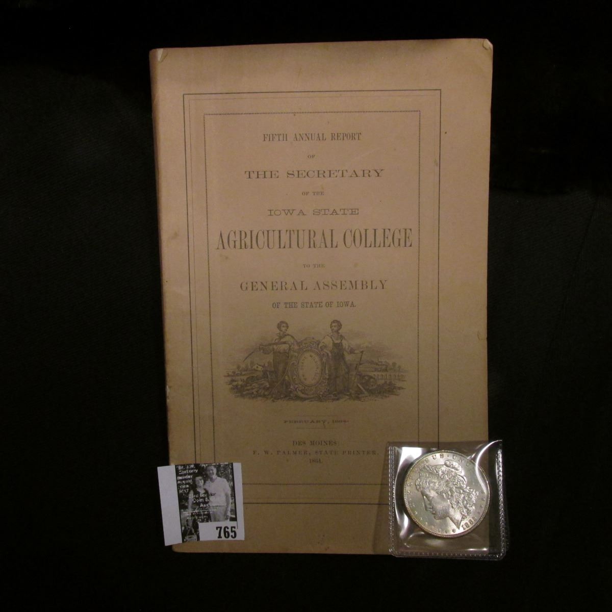 1864 "Fifth Annual Report of The Secretary of the Iowa State Agricultural College to the General Assembly of the State of Iowa"; and a Gem BU 1885 P U.S. Morgan Silver Dollar.