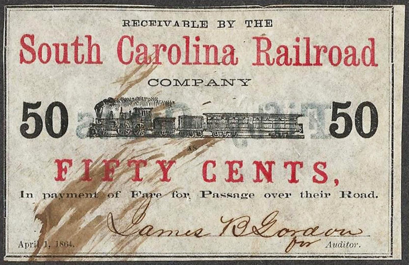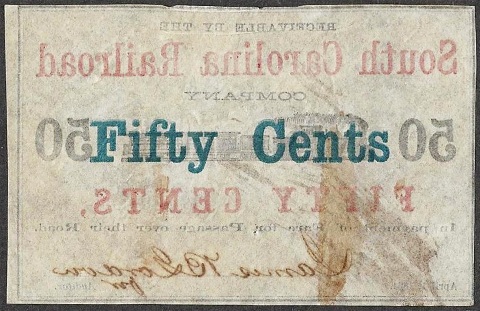 One 1864 Fifty Cents South Carolina Railroad Obsolete Note.