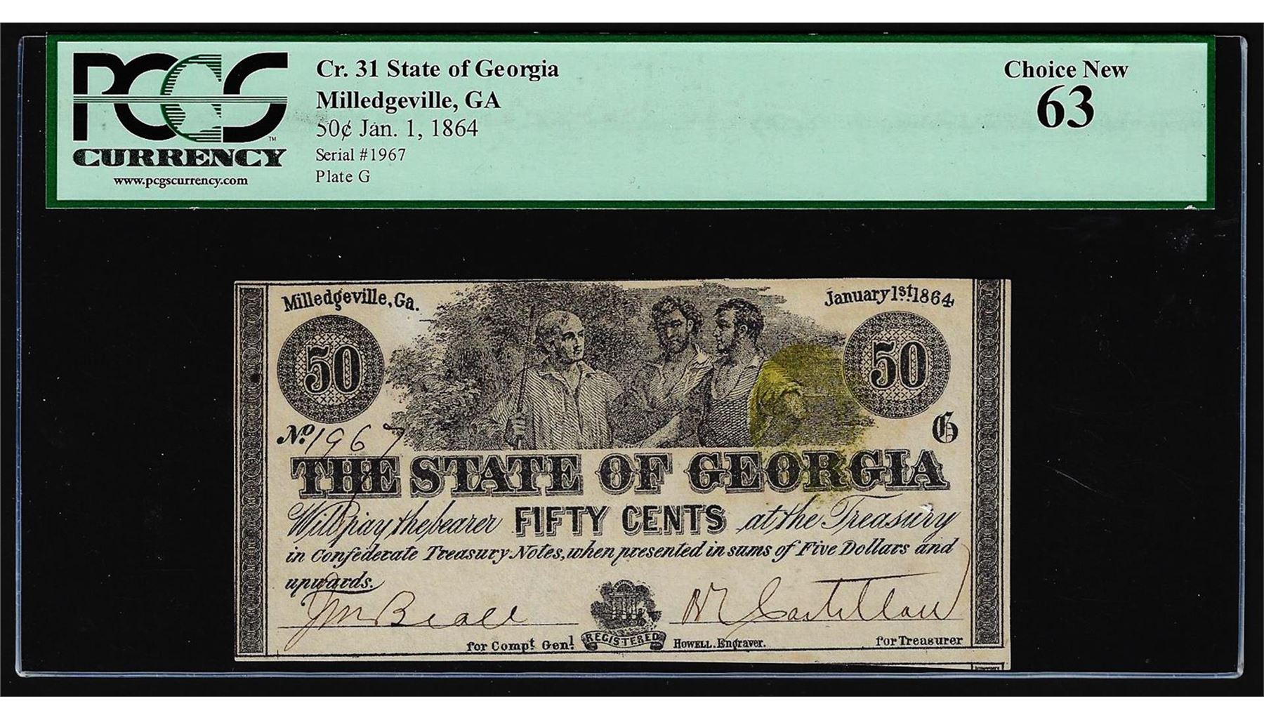 One 1864 Fifty Cents The State of Georgia Obsolete Note PCGS Choice New 63. PCGS Graded.
