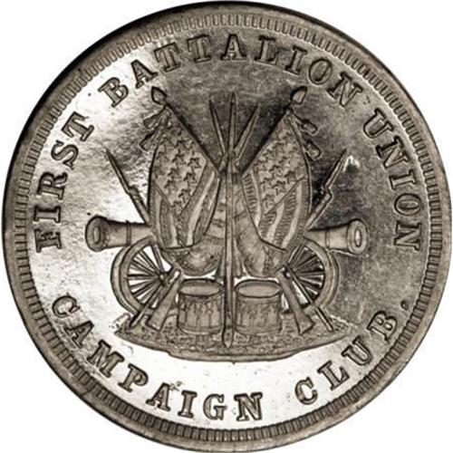 <B>1864 First Battalion Union Campaign Club PR60 Lightly Bent, Cleaned Uncertified.</B></I> White metal, 25mm. DeWitt-AL-1864-34. The obverse die is Fuld-131, the reverse has a central motif similar to Fuld-349 but the peripheral legend is FIRST BATTALION UNION CAMPAIGN CLUB. This untoned example is lightly bent from a small rim impression at 4 o'clock, and the fields are hairlined, although the majority of the striations are mint-made die polish lines. A rare variety collected by both Civil War and campaign medal specialists.<BR><BR><b>Shipping:</b> Coins & Currency (<a target="_blank" href="http://www.heritageauctions.com/common/shipping.php">view shipping information</a>)