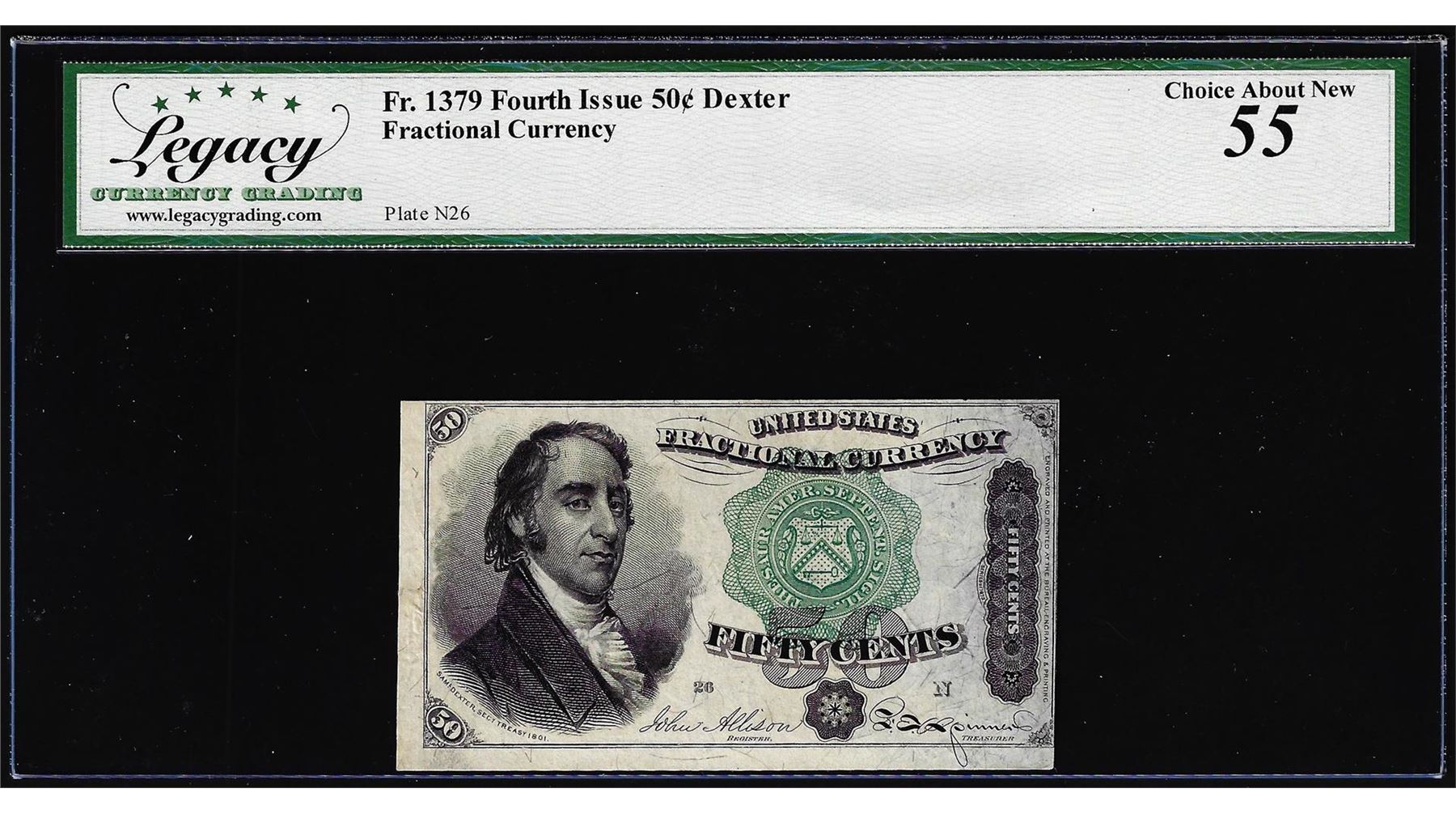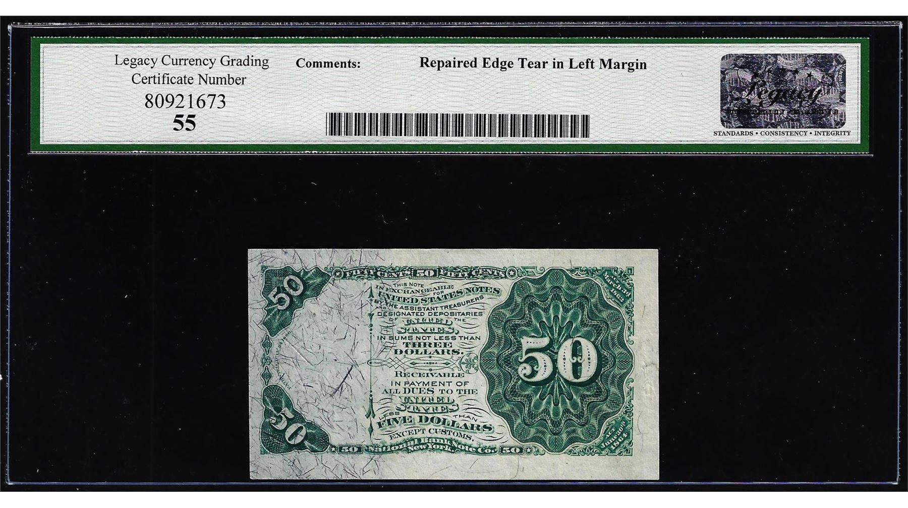 One 1864 Fourth Issue 50 Cent Fractional Currency Note Fr.1379 Legacy Choice About New 55. Legacy Graded.