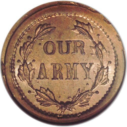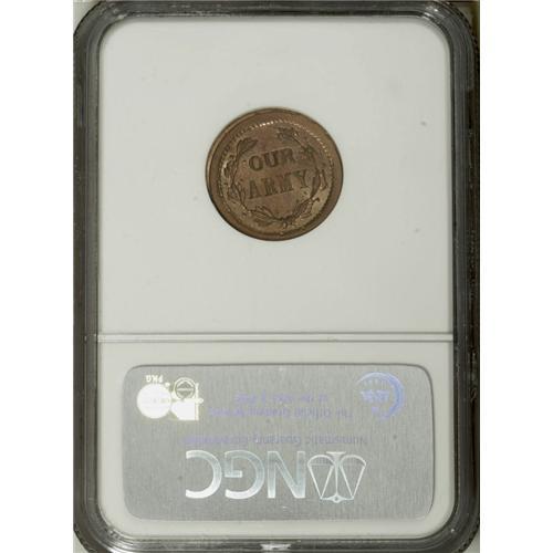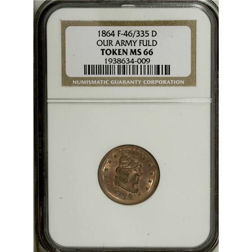 <B>1864 Our Army, Fuld 46/335D, MS66 NGC.</B></I> Copper. A fully lustrous Civil War token that in our opinion is an MS66 Red. This little fact was omitted on the insert from NGC. This is listed as a R.8 in the <I>Civil War Token Collectors Guide</B></I> by Bryon Kanzinger. With the lofty designation given by NGC, this might be one of the finest known and would fit into anyone's Civil War token collection.<BR><BR><b>Shipping:</b> Coin/Currency (<a target="_blank" href="http://www.heritageauctions.com/common/shipping.php">view shipping information</a>)