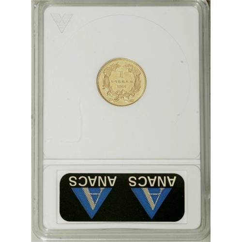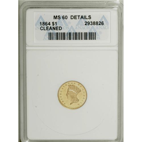 <B>1864 G$1 --Cleaned--ANACS. MS60 Details.</B></I> A well struck and prooflike piece with much better eye appeal than suggested by the strict ANACS designation. A rare Civil War date with a mintage of 5,900 pieces.<BR><I>From The Twin Hollows Collection, Part Two.</B></I><BR><BR><b>Shipping:</b> Coins & Currency (<a target="_blank" href="http://www.heritageauctions.com/common/shipping.php">view shipping information</a>)