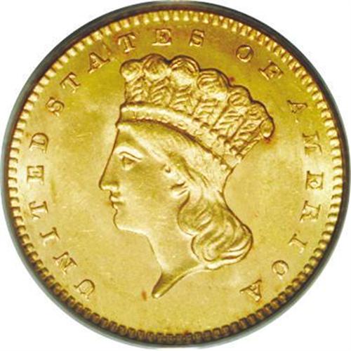 <B>1864<G$1> MS64 PCGS.</B></I> A rare, low mintage issue with a business strike production of only 5,900 pieces. This coin is just a tad soft in the centers with strong peripheral details. The fields are bright from having been struck from lapped dies, and these now show numerous vertical striations that enhance the appearance. Overall, the color is bright yellow-gold. An especially attractive coin for the assigned grade. Population: 9 in 64, 13 finer (4/06).
