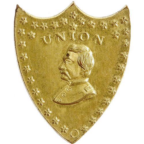 <B>Very Rare 1864 George McClellan Campaign Pin in Form of a Shield.</B></I> These shield-shaped pieces are highly prized by collectors for their distinctive appearance. More often than not they are seen with a silvered surface, but this one is on bright gilded brass. Nearly identical to Sullivans GMcC 1864-71, but slightly smaller at 18mm x 22mm. Choice condition. Originally intended to have a stick pin on reverse, but no pin was ever affixed to this example.
