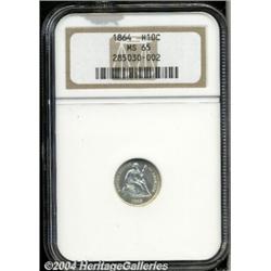 <B>1864<H10C> MS65 NGC.</B></I> Although 48,000 business strikes were produced, according to the <I>Guide Book,</B></I> the 1864 is tougher than the reportedly much lower mintage 1863. A semi-prooflike Gem with faint peripheral gold patina and bold clashmarks on each side. Well struck aside from a portion of the upper left side of the wreath. Population: 11 in 65, 3 finer (7/04). <BR><BR><B>Important notice:</B> Heritage usually auctions material at the rate of 200-250 lots per hour. On some occasions eBay Live bid software or the Internet may not be able to keep up with the pace of the auction. We recommend placing a realistic absentee bid now as insurance to avoid disappointment. Occasionally the auctioneer may eliminate or reject an eBay Live bid, and the auctioneer may also reopen a lot after the close of the eBay live bidding (usually because we missed an audience bid), and may reject your bid even if it shows you as the winning bidder. By bidding via eBay Live, you agree that Heritage may award the lot to another bidder at its sole discretion under the circumstances described above or any other reasonable circumstances. Since eBay bids are not shown to us until we open the lot on the floor, we treat those bids just like floor bids. In most cases the floor responds before the eBay bid is presented to us, due to Internet lag time, so for consistency we have made it a policy that floor bids are always considered first over tie eBay live bids. Also please note that all Heritage lots purchased through eBay Live carry a 20% Buyer's Premium. Please make sure you read the Terms and Conditions before you bid. </span></font></tr></table></td></tr></table>