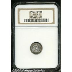 <B>1864<H10C> PR62 NGC.</B></I> Golden-brown and violet colors enrich this well struck example. The field above HALF is moderately marked. Only 470 proofs were struck, along with 48,000 business strikes, which makes the 1864 among the rarest Philadelphia Mint Seated Dime issues.<BR><I>From The Greg and Lesia Hosch Collection.</B></I> <BR><BR><B>Important notice:</B> Heritage usually auctions material at the rate of 200-250 lots per hour. On some occasions eBay Live bid software or the Internet may not be able to keep up with the pace of the auction. We recommend placing a realistic absentee bid now as insurance to avoid disappointment. Occasionally the auctioneer may eliminate or reject an eBay Live bid, and the auctioneer may also reopen a lot after the close of the eBay live bidding (usually because we missed an audience bid), and may reject your bid even if it shows you as the winning bidder. By bidding via eBay Live, you agree that Heritage may award the lot to another bidder at its sole discretion under the circumstances described above or any other reasonable circumstances. Since eBay bids are not shown to us until we open the lot on the floor, we treat those bids just like floor bids. In most cases the floor responds before the eBay bid is presented to us, due to Internet lag time, so for consistency we have made it a policy that floor bids are always considered first over tie eBay live bids. Also please note that all Heritage lots purchased through eBay Live carry a 20% Buyer's Premium. Please make sure you read the Terms and Conditions before you bid.
