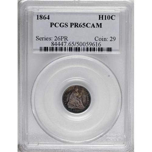 <B>1864 H10C PR65 Cameo PCGS.</B></I> Blue-green, orange, lavender, and russet converge on the small surfaces of this war-date half dime. The contrast is surprisingly strong, given the depth and coverage of this Gem's patina. Population: 4 in 65 Cameo, 4 finer (6/07).<BR><BR><b>Shipping:</b> Coins & Currency (<a target="_blank" href="http://www.heritageauctions.com/common/shipping.php">view shipping information</a>)