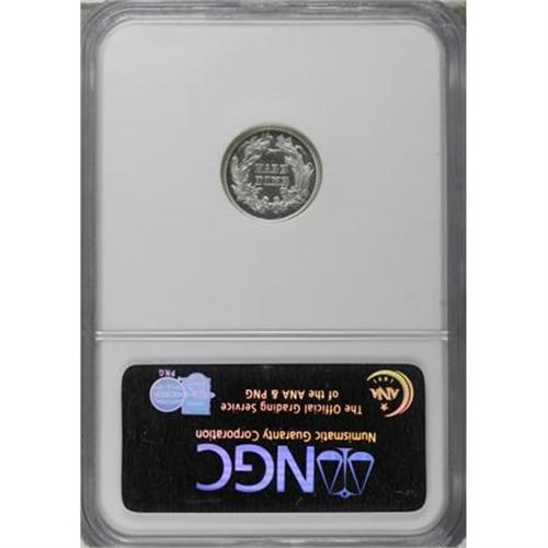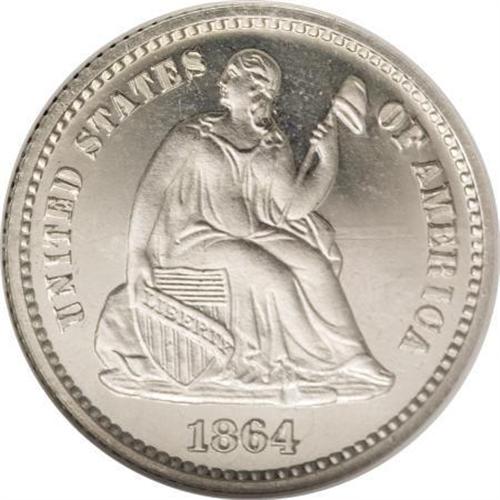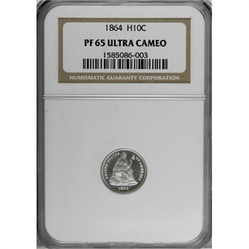 <B>1864 H10C PR65 Deep Cameo NGC.</B></I> Proof half dimes of 1864 are more elusive than the 470-piece mintage might suggest, and in Deep Cameo they are extremely rare. NGC and PCGS have each certified a solitary 1864 proof in this classification! White-on-black contrast greets the observer of this Gem proof specimen. Crisp definition is displayed on the motifs, and untoned surfaces have been well cared for. A small planchet defect is visible in the rock above the 4 in the date. Simply outstanding overall eye appeal!<BR><BR><b>Shipping:</b> Coins & Currency (<a target="_blank" href="http://www.heritageauctions.com/common/shipping.php">view shipping information</a>)