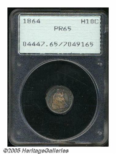 <B>1864<H10C> PR65 PCGS.</B></I> Vivid-blue frames the violet and gold centers of this Gem proof. Some minor strike-throughs are noted particularly on the reverse.