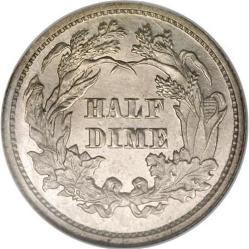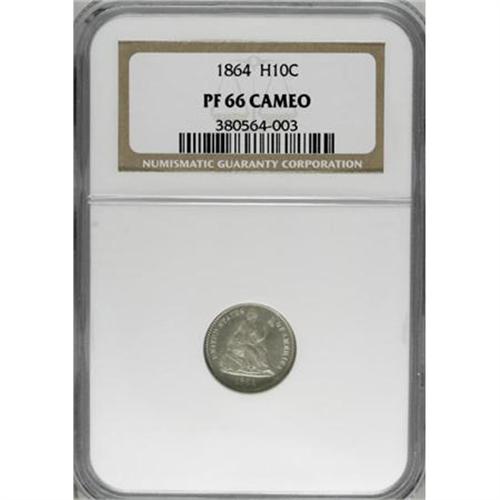 <B>1864 H10C PR66 Cameo NGC.</B></I> This is another low-mintage date in the Seated half dime series that accordingly exerts added pressure on the few surviving proofs to fill those empty holes in a date set. Only 48,000 business strikes were produced, along with 470 proofs. The present proof offers silver-gold devices, with good contrast overall and a pleasing appearance. Census: 2 in 66 Cameo, 3 finer (6/07).<BR><BR><b>Shipping:</b> Coins & Currency (<a target="_blank" href="http://www.heritageauctions.com/common/shipping.php">view shipping information</a>\)
