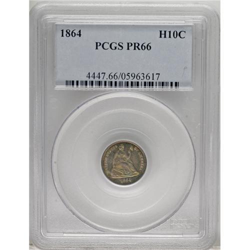 <B>1864 H10C PR66 PCGS.</B></I> Glorious apple-green, gold, and rose iridescence adorns the obverse of this crisply struck specimen. The reverse shows a layer of mottled lilac and gray patina. The obverse fields retain noteworthy reflectivity, and both sides are impeccably preserved. Population: 5 in 66, 2 finer (2/07).<BR><BR><b>Shipping:</b> Coins & Currency (<a target="_blank" href="http://www.heritageauctions.com/common/shipping.php">view shipping information</a>)
