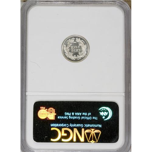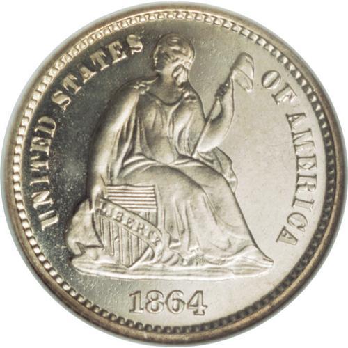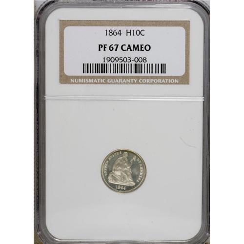 <B>1864 H10C PR67 Cameo NGC.</B></I> The 1864 is one of the key dates to the Seated half dime series. The business strike mintage was a modest 48,000 pieces, and that of the proofs a mere 470 coins. While nearly 300 proofs have been certified by NGC and PCGS, only about 30 specimens have been given the Cameo designation. The Superb Gem Cameo that we offer in this lot is one of the three finest! Its untoned surfaces reveal profound field-motif contrast and crisply impressed design features. A faint pinscratch on the right (left facing) breast and a few minute marks on the cheek are mentioned for complete accuracy, and help to identify the coin.<BR><BR><b>Shipping:</b> Coins & Currency (<a target="_blank" href="http://www.heritageauctions.com/common/shipping.php">view shipping information</a>)