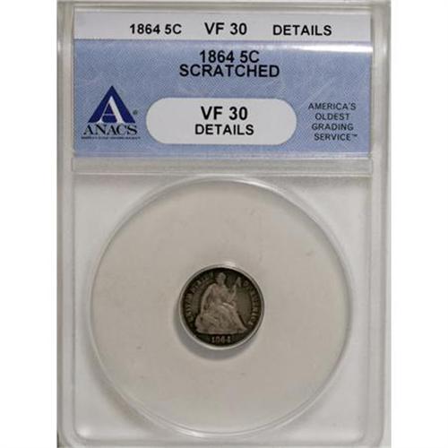 <B>1864 H10C --Scratched--ANACS .VF30 Details.</B></I> NGC Census: (0/36). PCGS Population (1/49). Mintage: 48,000. Numismedia Wsl. Price for NGC/PCGS coin in VF30: $546. (#4384)<BR><BR><B>Coin Engraver:</B> Christian Gobrecht<BR><BR><b>Shipping:</b> Coins & Currency (<a target="_blank" href="http://www.heritageauctions.com/common/shipping.php">view shipping information</a>)