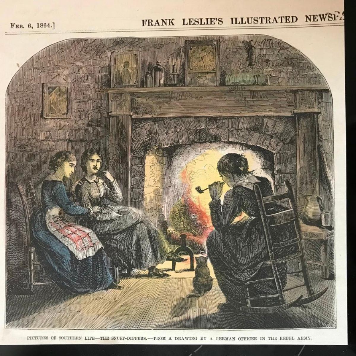 1864 Hand-colored engraving, from Frank Leslie's Illustrated Newspaper, Pictures of Southern Life - The Snuff-Dippers. 6" X 6 1/2".