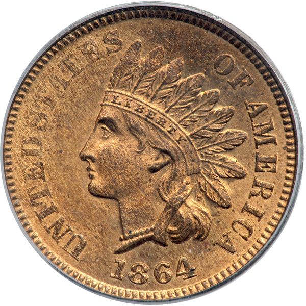 1864 Indian Head Cent. Bronze, with "L". PCGS graded MS-64+ Red and Brown. Loaded with a majority of original mint red. Stored in an old Wayte Raymond folder for over 50 years. Mint officials in 1864 probably considered the addition of Longacre's initial to the ribbon below the lowest feather to be a minor change that was not worth mentioning publicly. It was not until a few years later that the existence of these became known. Pop 1; 68 in 65 RB; 3 in 66 RB (PCGS # 2080) .