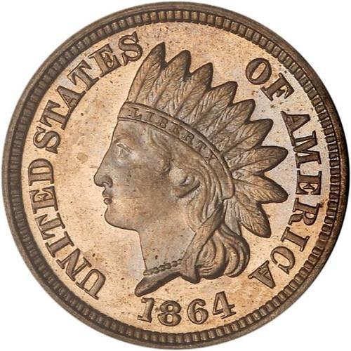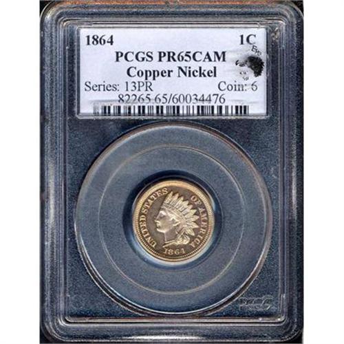 <b>1864 Indian Head Cent. Copper-nickel. PCGS graded PF65 CAM.</b> Well detailed for this more difficult Civil War issue, with soft golden-orange accents at the rims that add considerably to the appeal of this nearly pristine cameo Gem. The frost at the head of Liberty and on the wreath and shield give it the beautiful two-tone appearance that collectors of Proofs always want to see (but rarely get the chance to bid on). Really choice Proofs like this are scarce. Yet strange at it may seem, the 1864 may be the most widely available Proof copper-nickel cent after the 1862. Bowers lists the order of rarity as follows: 1860 (rarest), 1861, 1863, 1864, and 1862 (most available) <b>(PCGS # 82265)</b>