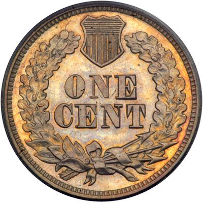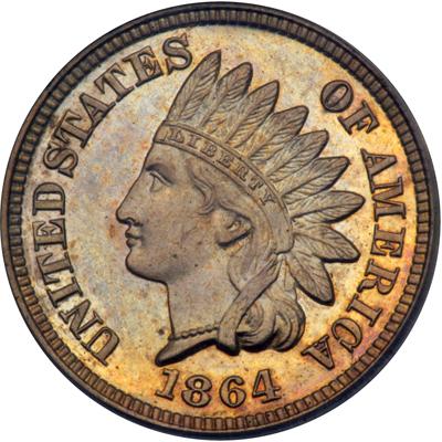 1864 Indian Head Cent. Copper-nickel. PCGS graded Proof 65. Nice light golden toning. Only 370 Proofs struck. How could it be anything but scarce with such a low mintage! Look into your glass, dear reader, and what do you see? Nothing more nor less than a crisp, beautiful, original Gem Proof copper-nickel cent of the last year of this short design, which stretched half a decade from 1859 to 1864 during a tumultuous turmoil period in American history. This was the time of the "War of the Rebellion" as it is termed in the official Congressionally authorized history of the event. Pop 43; 8 in 66; 2 in 67. (PCGS # 2265).
