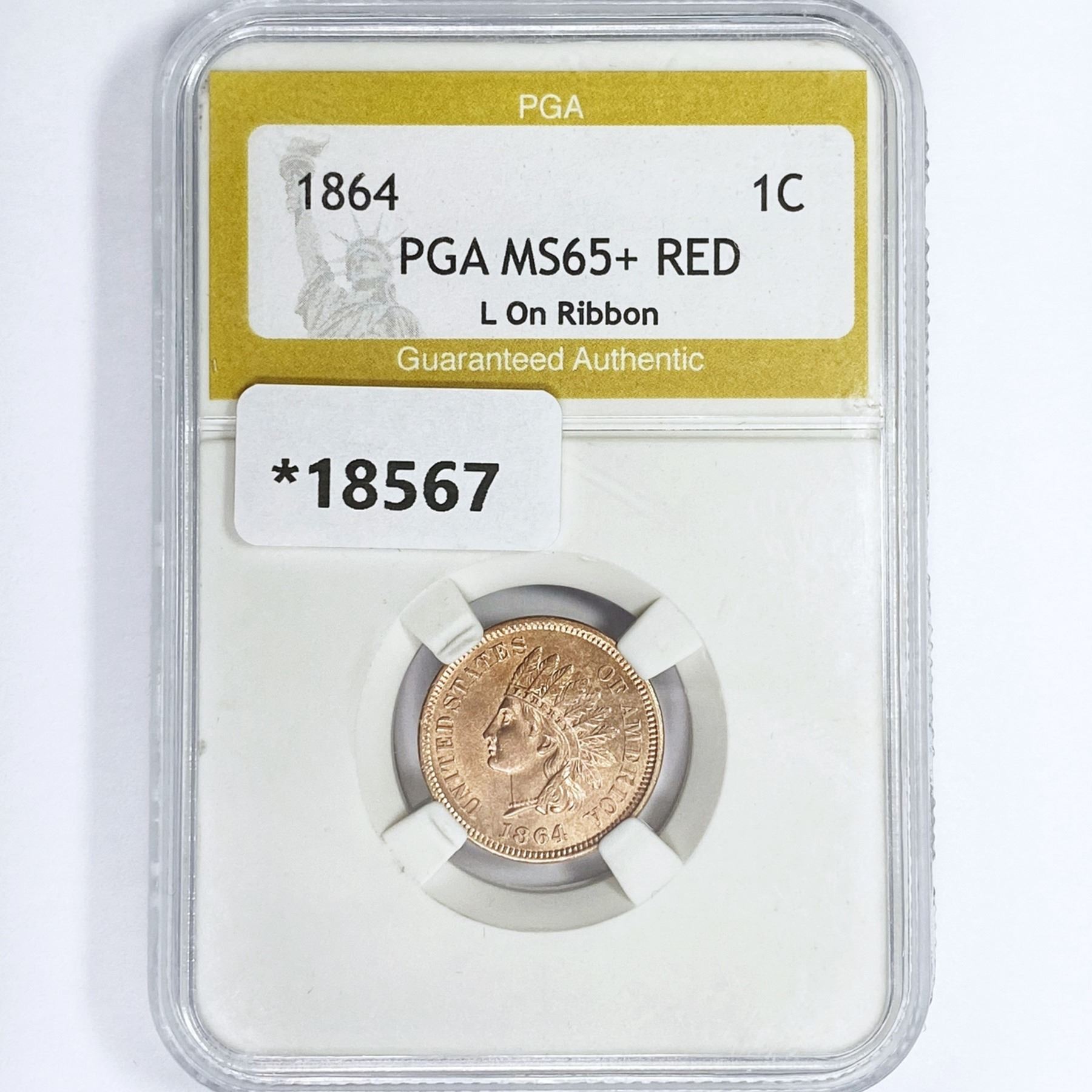 1864 Indian Head Cent PGA MS65+ RED, L On Ribbon