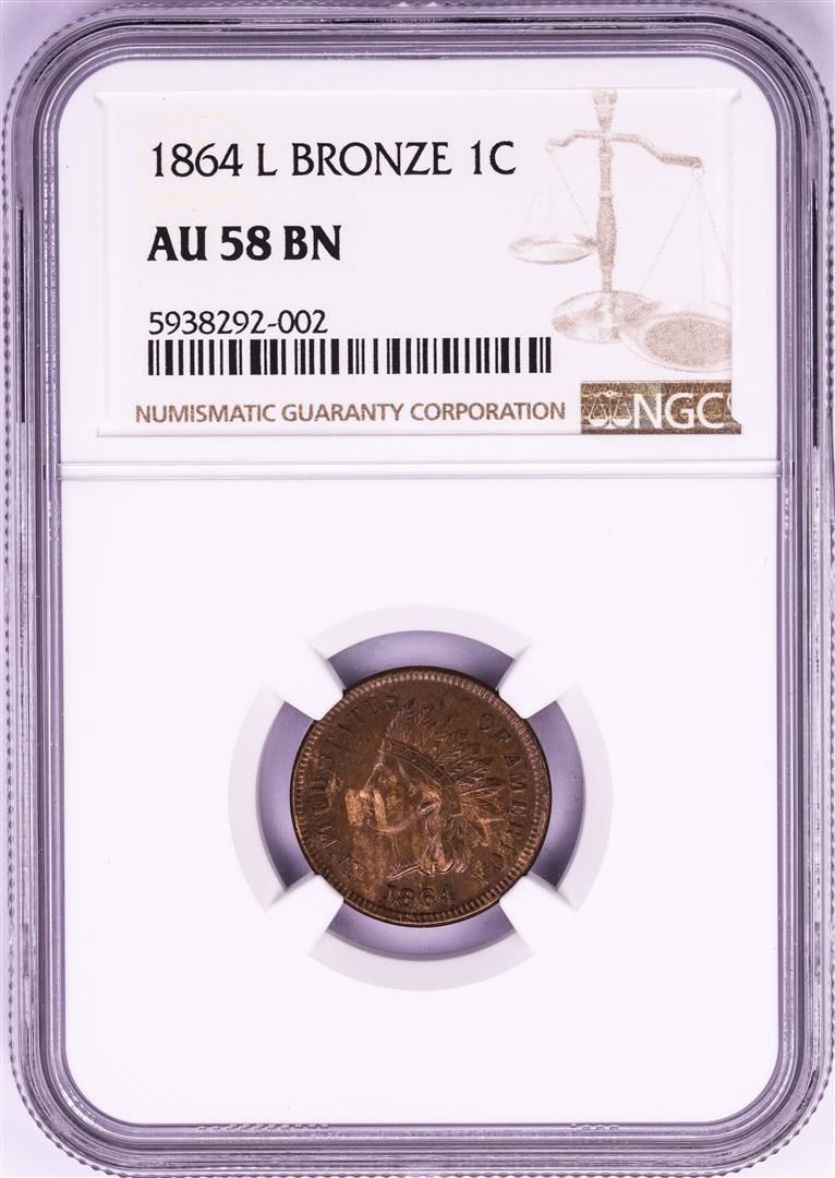 One 1864 L Bronze Indian Head Cent Coin NGC AU58BN. NGC Certified.